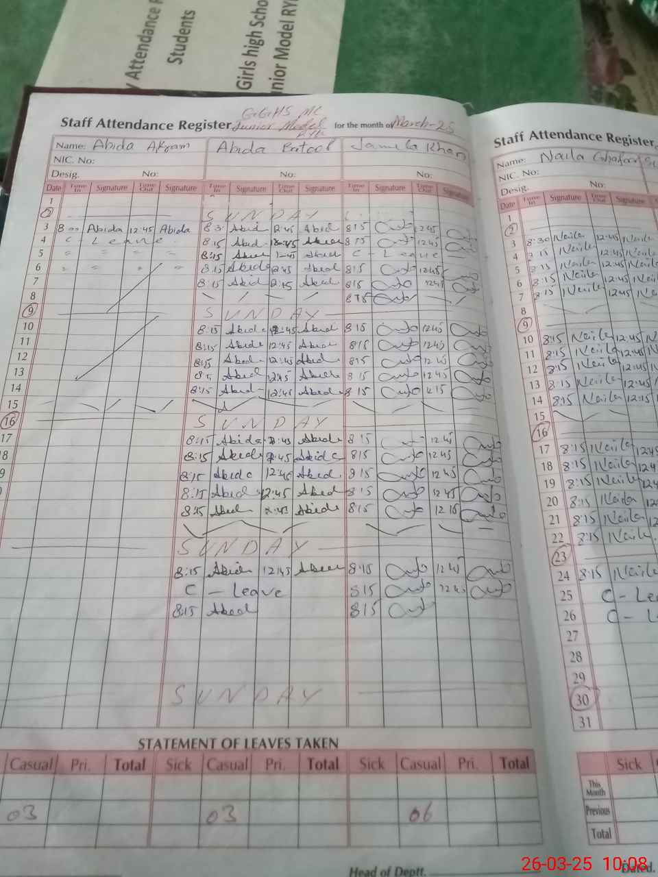 | Remarks (Use Separate Page if Required): Teacher Abida Ikram online leave not approved from 04 march to till date Teacher Maryam Zafar online leave not approved from to till date Both Marked Absent Students attendance zero due to Exam Off | |||||