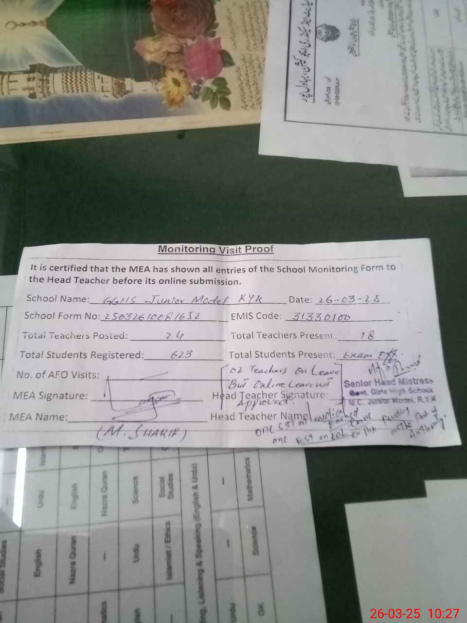 | EMIS Code: 31330100 | Name of School: GGHS MC JUNIOR MODEL R.Y.KHAN | |||