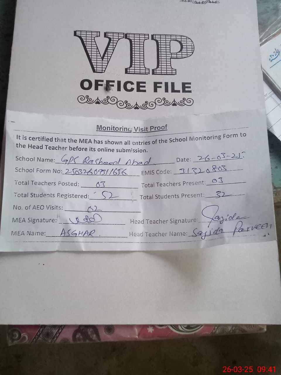 | Attendance Register | Head Teacher | MEA with School | Visit Proof |