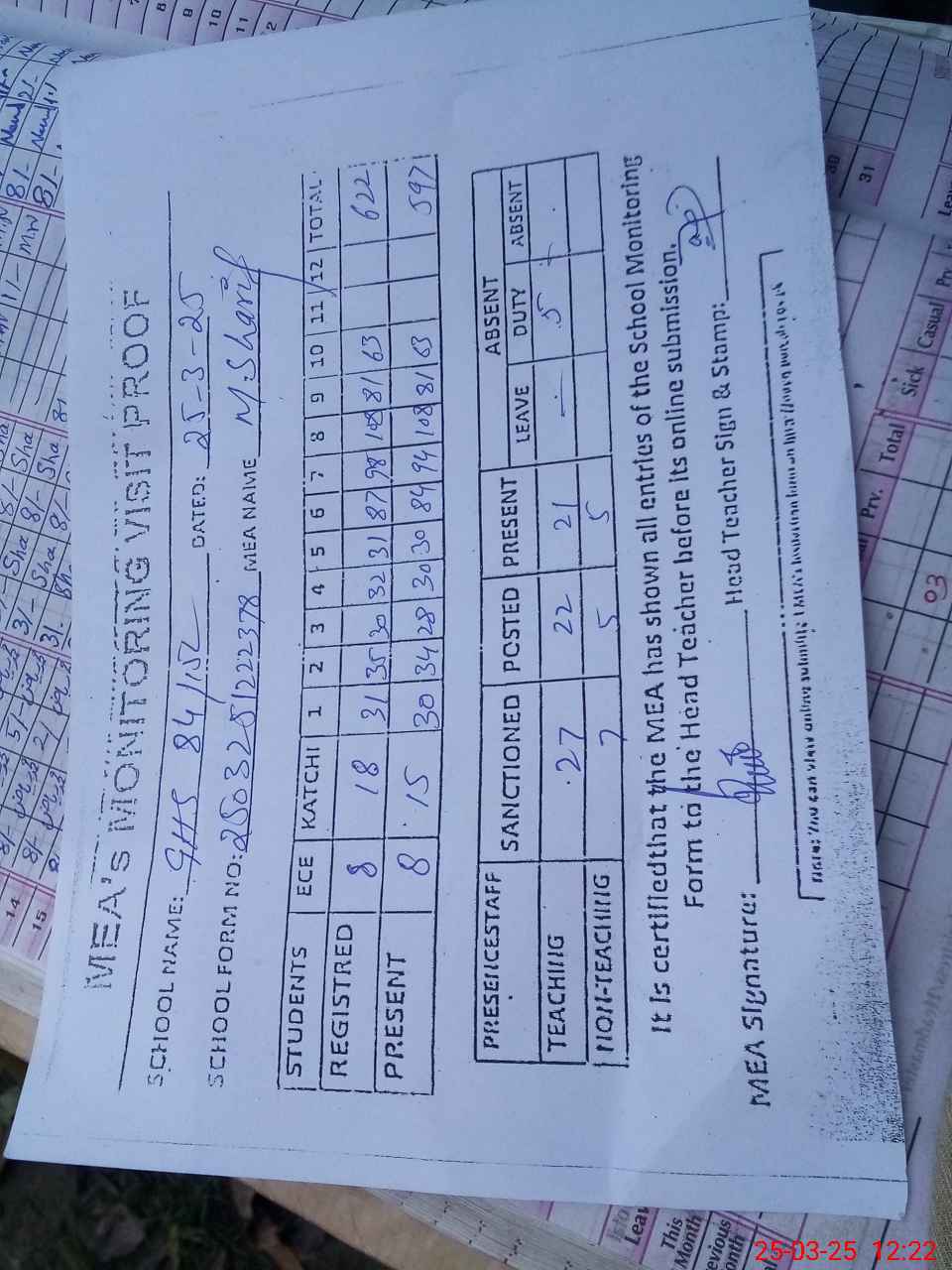 | Attendance Register | Head Teacher | MEA with School | Visit Proof |