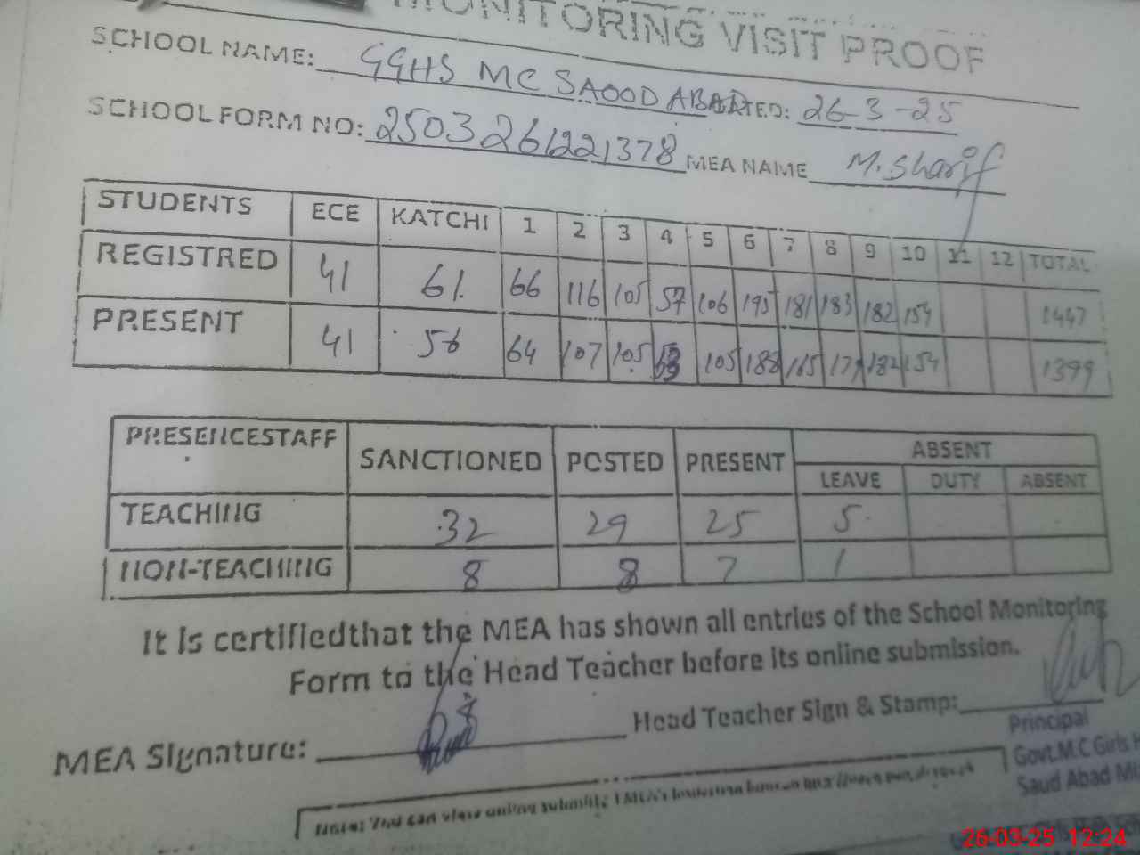 | Attendance Register | Head Teacher | MEA with School | Visit Proof |
