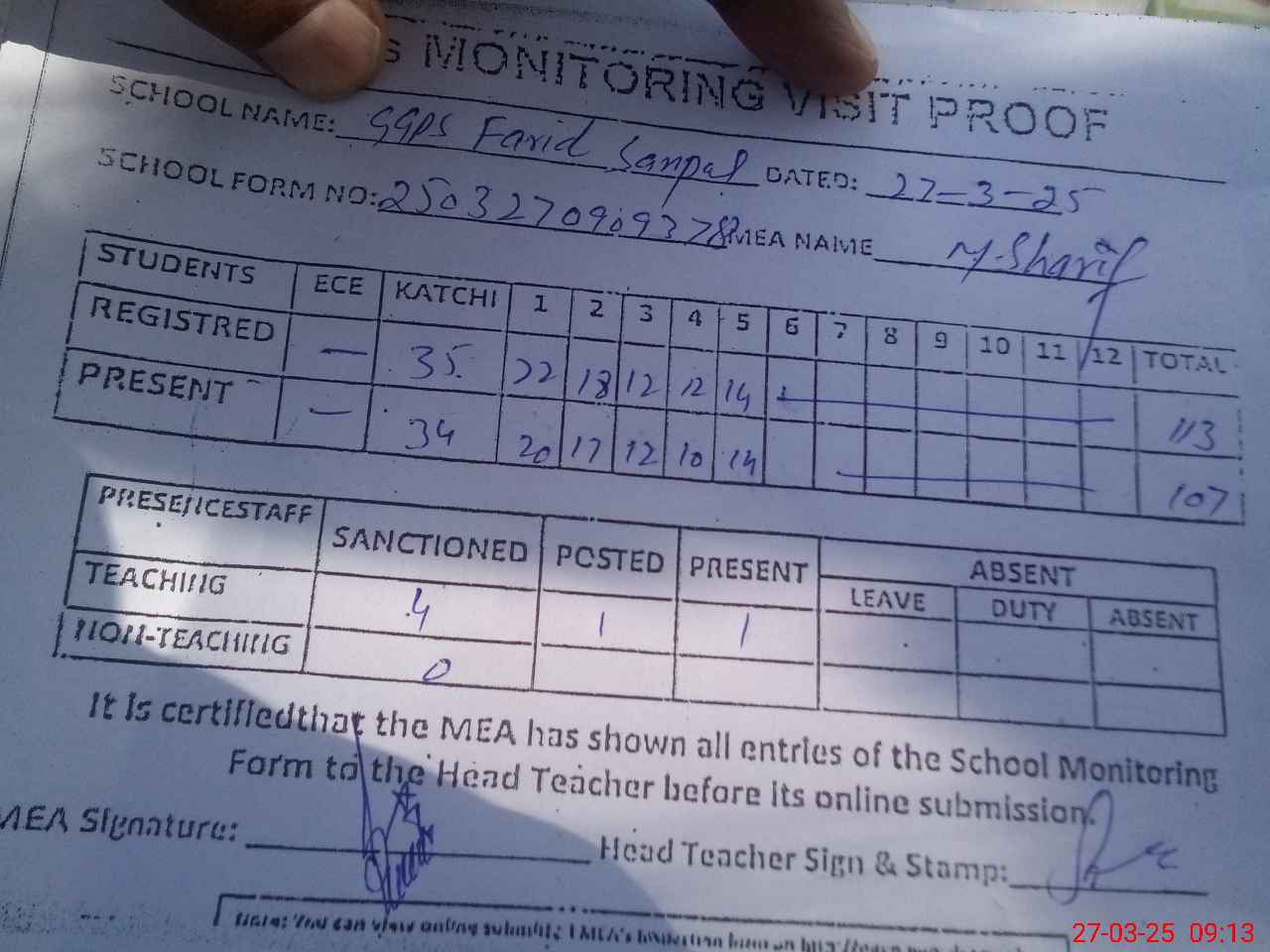| EMIS Code: 36430358 | Name of School: GGPS FARID SANPAL, TULAMBA | |||
