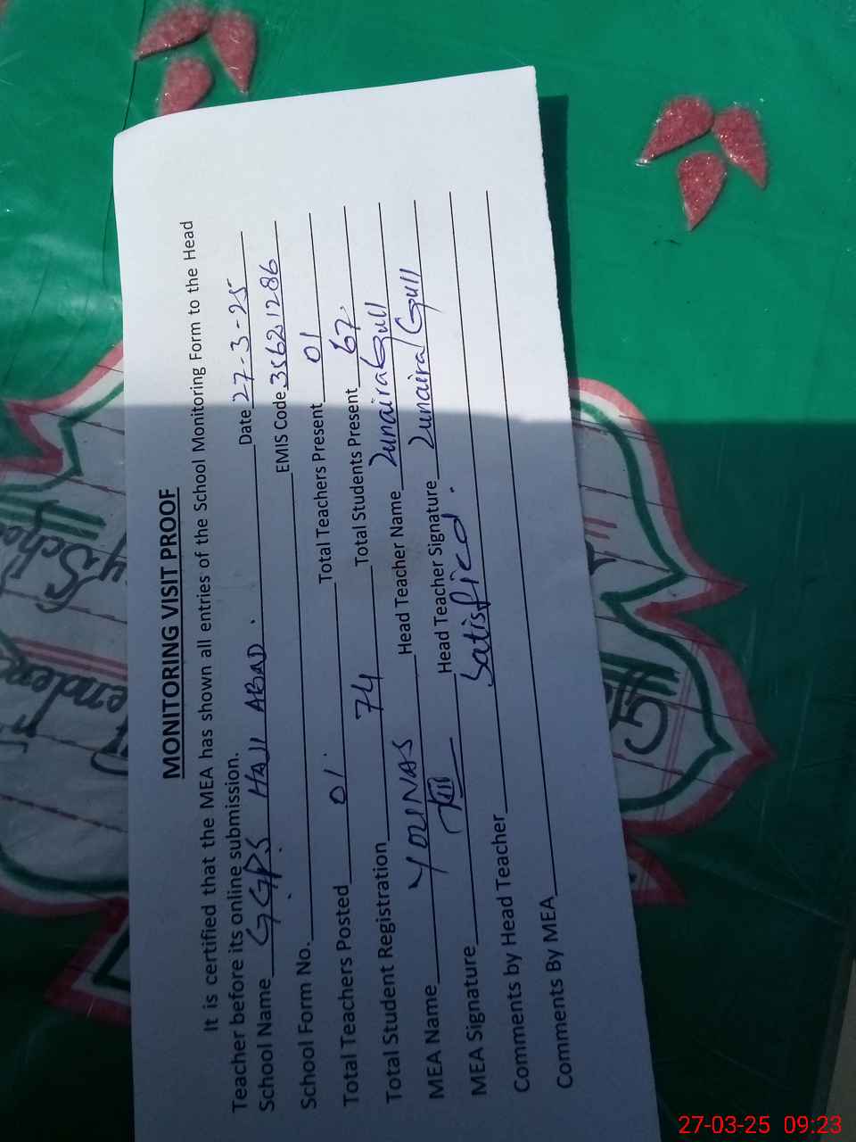 | Attendance Register | Head Teacher | MEA with School | Visit Proof |