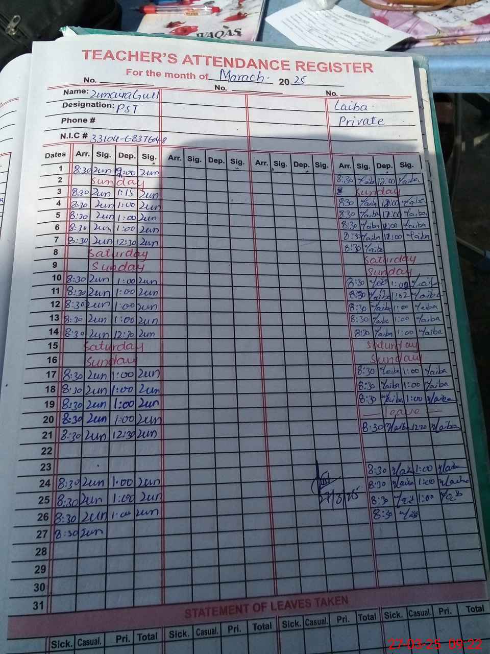 | CNIC | Full Name | Designation | R/C | Absence During Last Calender Month |
