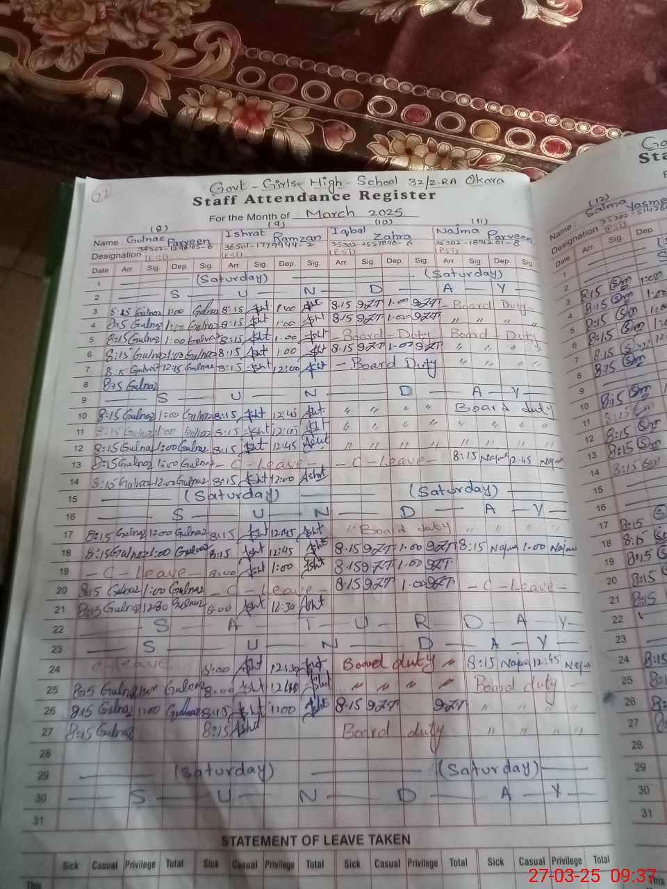 | 35**** | Iq**** Za**** Ta**** | EST | Regular | 0 | 0 | 0 | 0 | 0 | 0 | 0 | 0 | 0 | Exam Duty |