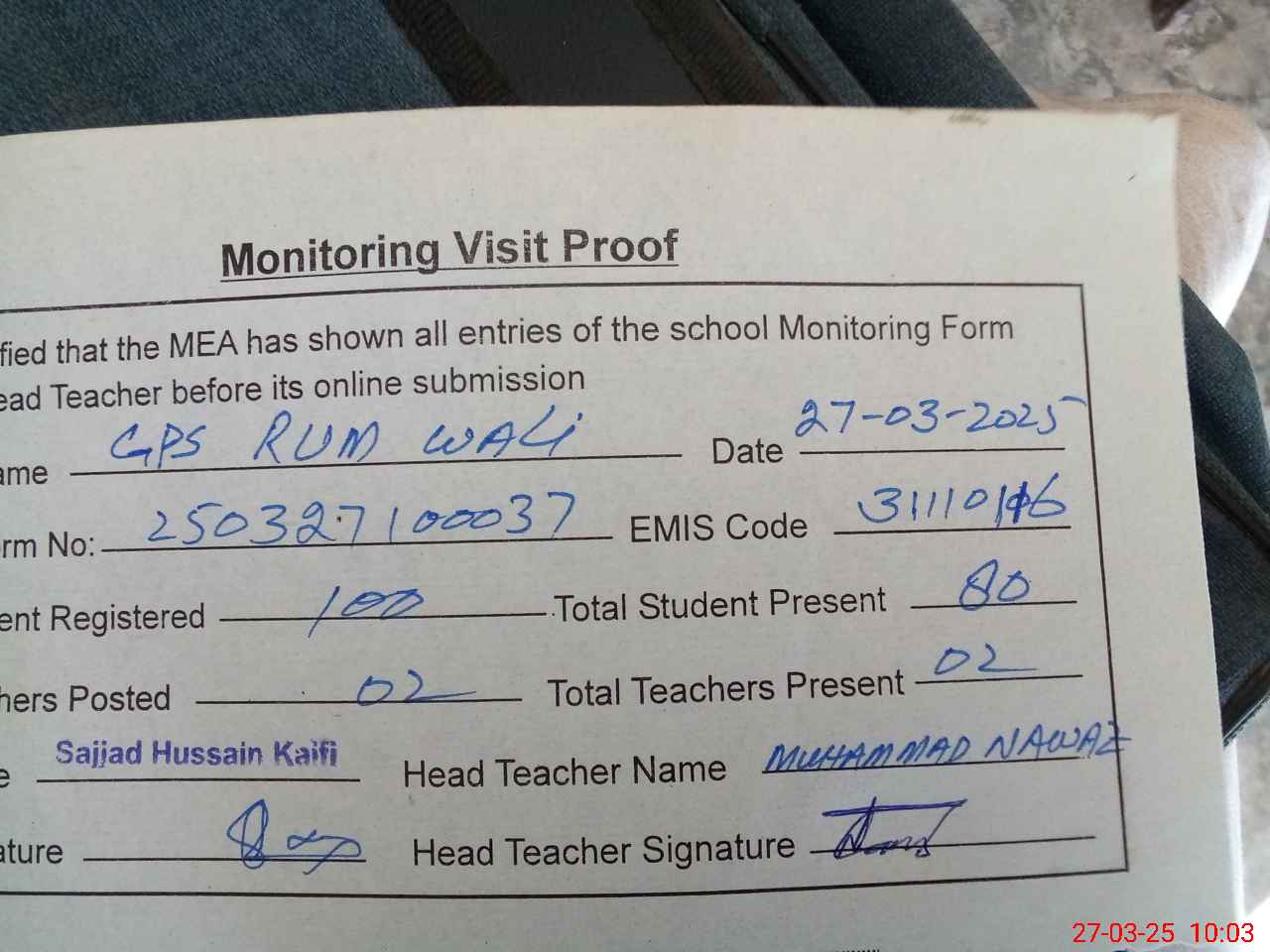 | Attendance Register | Head Teacher | MEA with School | Visit Proof |