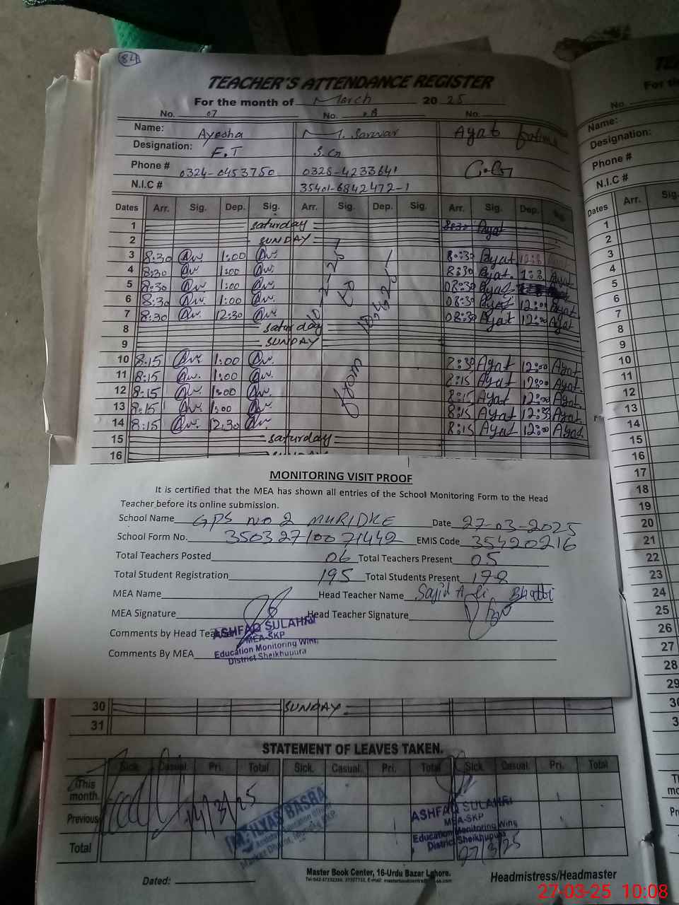 | Attendance Register | Head Teacher | MEA with School | Visit Proof |