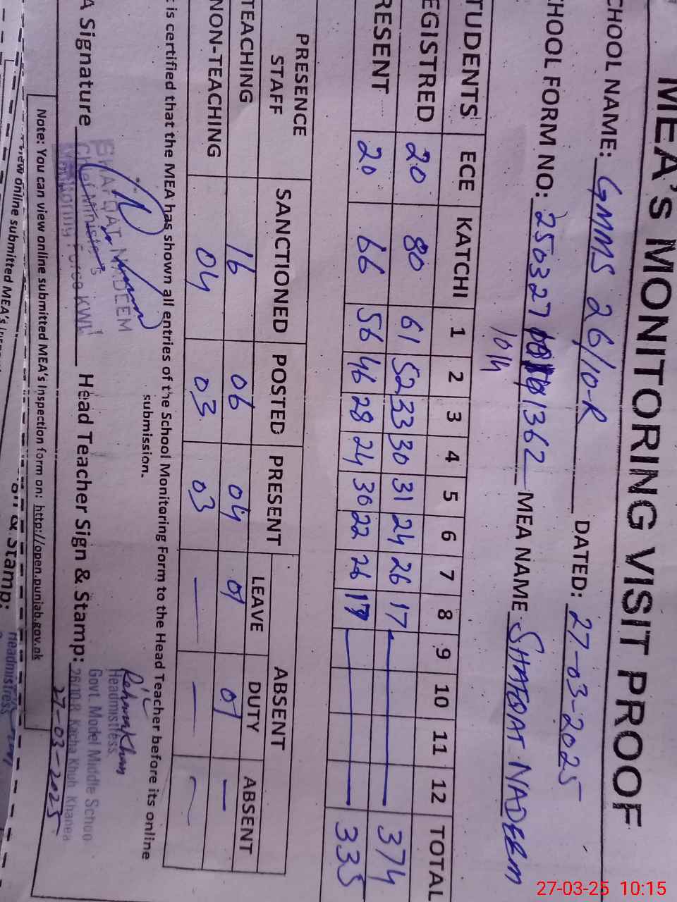 | Attendance Register | Head Teacher | MEA with School | Visit Proof |
