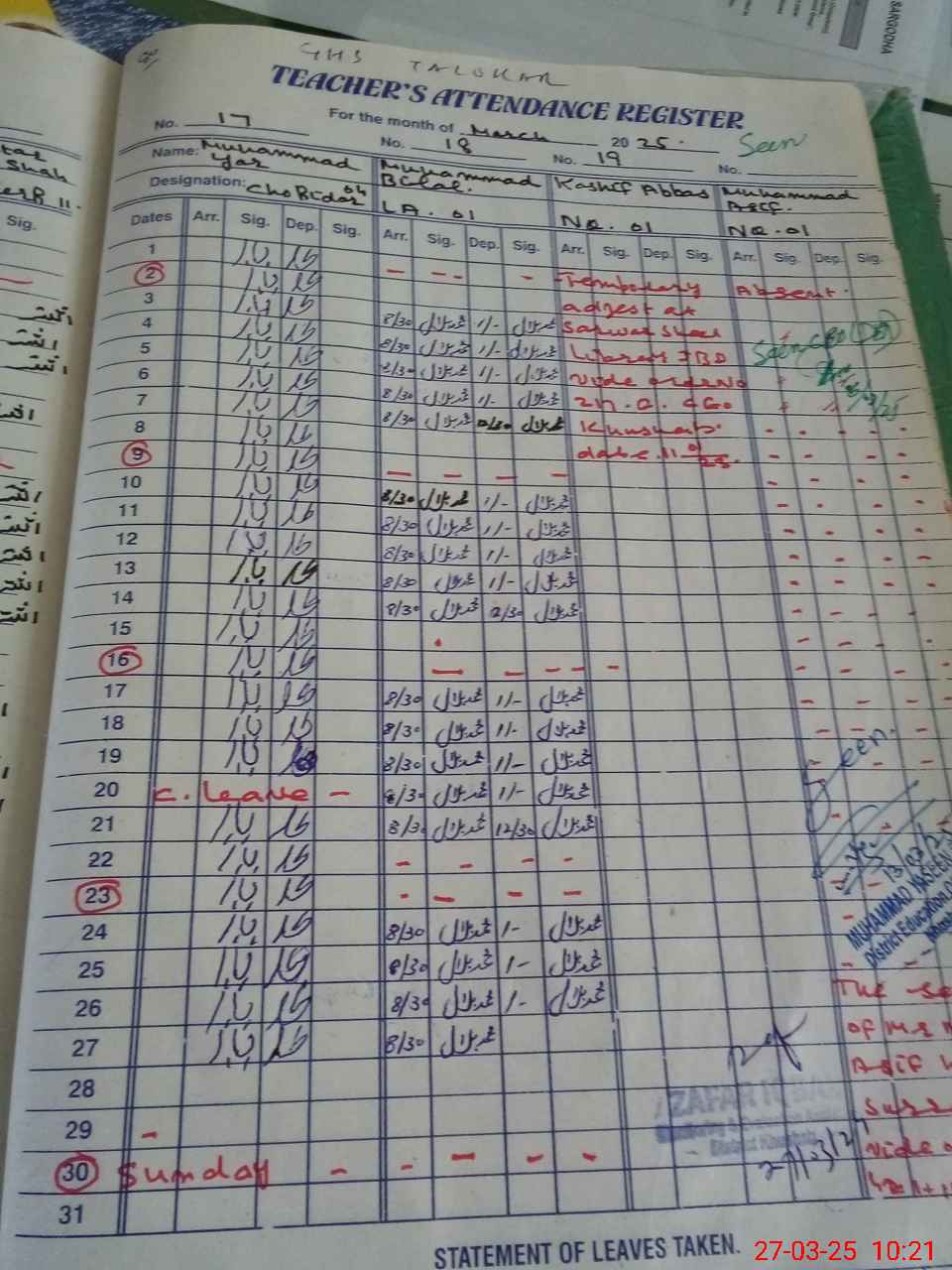 | CNIC | Full Name | Designation | R/C | Absence During Last Calender Month |