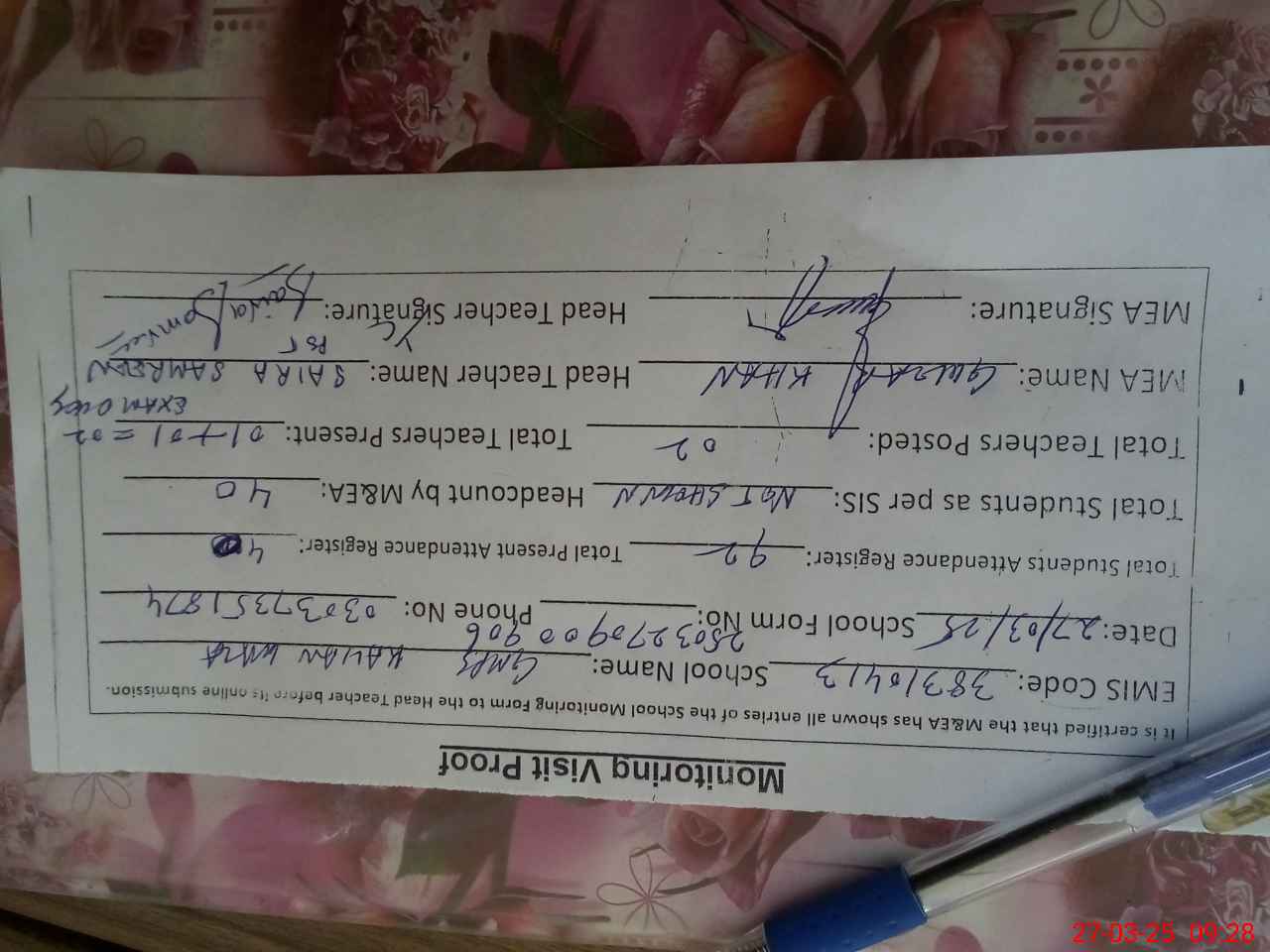 | Attendance Register | Head Teacher | MEA with School | Visit Proof |