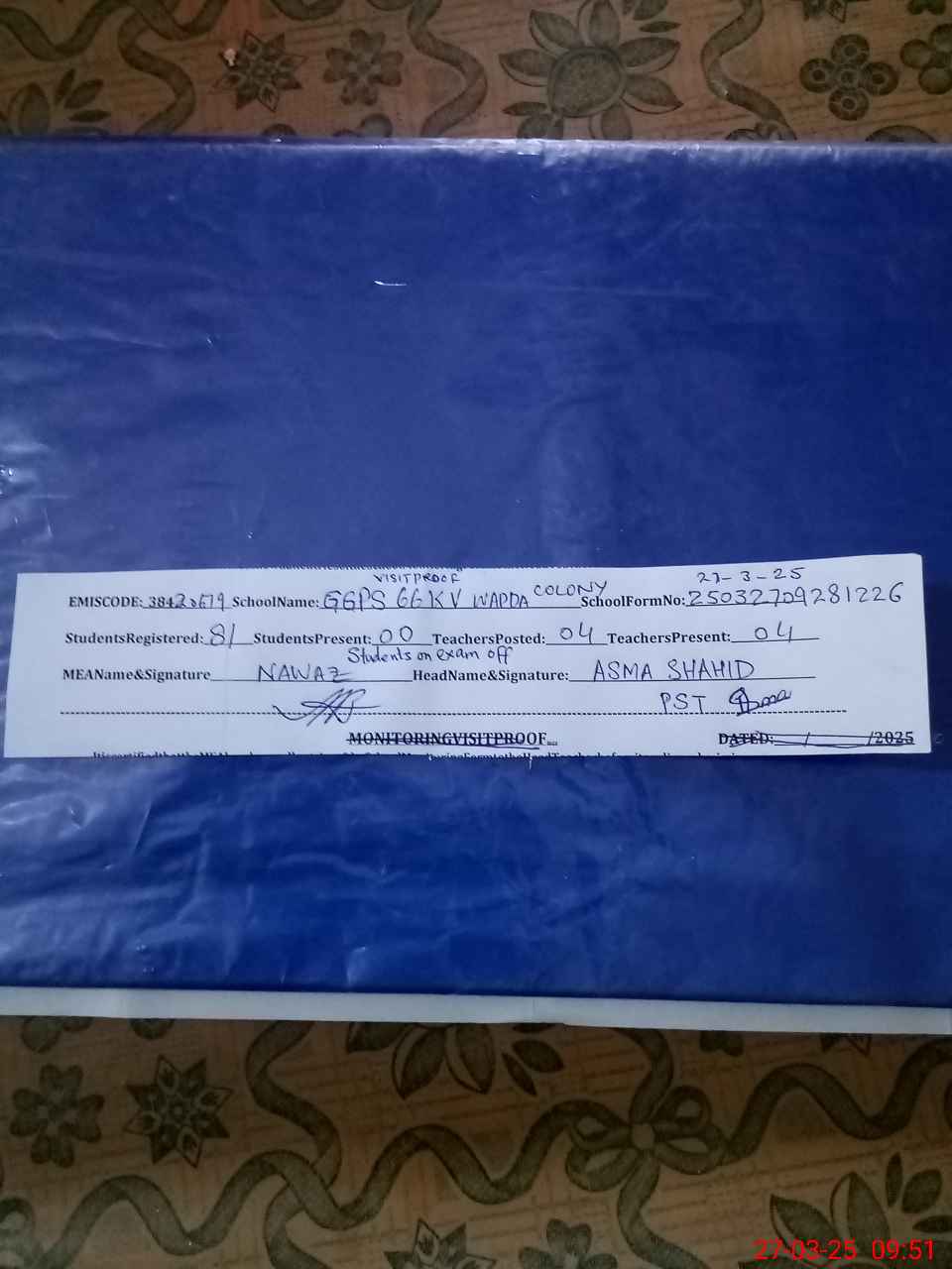 | EMIS Code: 38420679 | Name of School: GGPS 66 KV WAPDA COLONY | |||