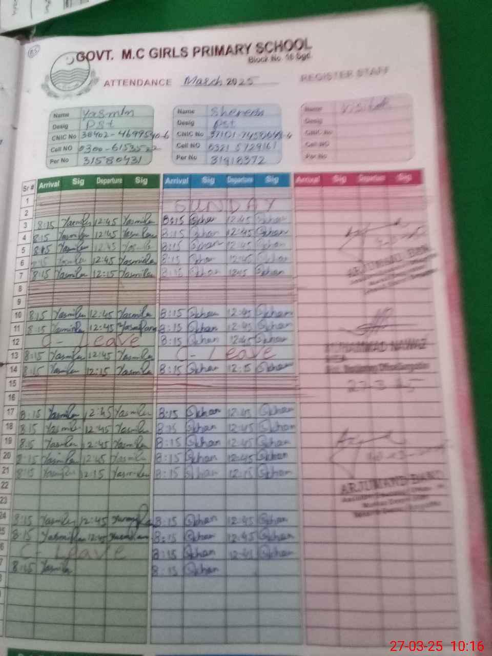 | CNIC | Full Name | Designation | R/C | Absence During Last Calender Month |