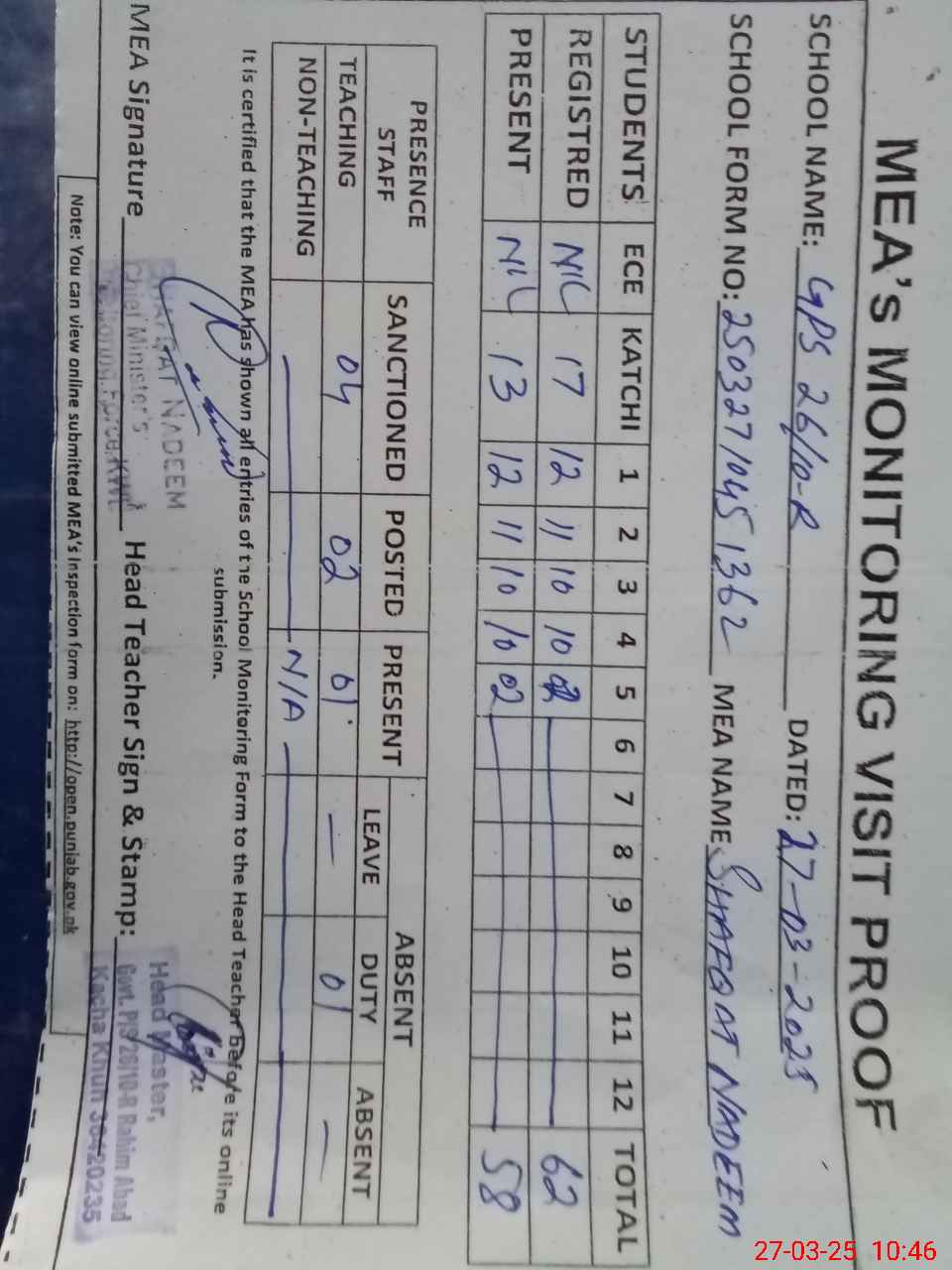 | Attendance Register | Head Teacher | MEA with School | Visit Proof |