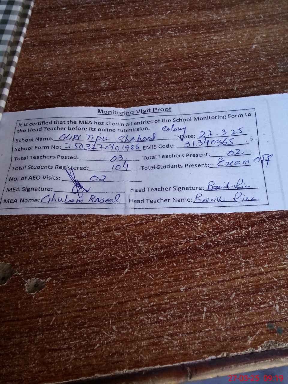 | Attendance Register | Head Teacher | MEA with School | Visit Proof |