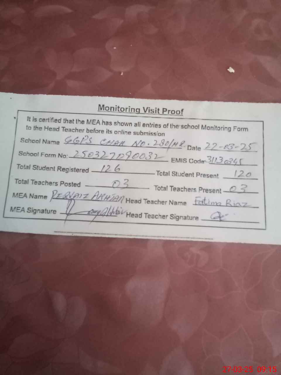 | Attendance Register | Head Teacher | MEA with School | Visit Proof |