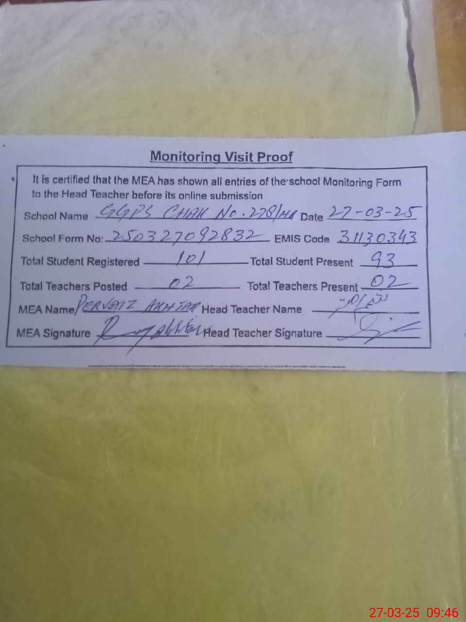 | Attendance Register | Head Teacher | MEA with School | Visit Proof |