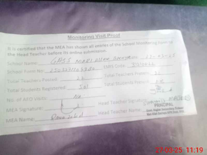 | EMIS Code: 31310022 | Name of School: GHSS MARI ALLAH BACHAYA | |||