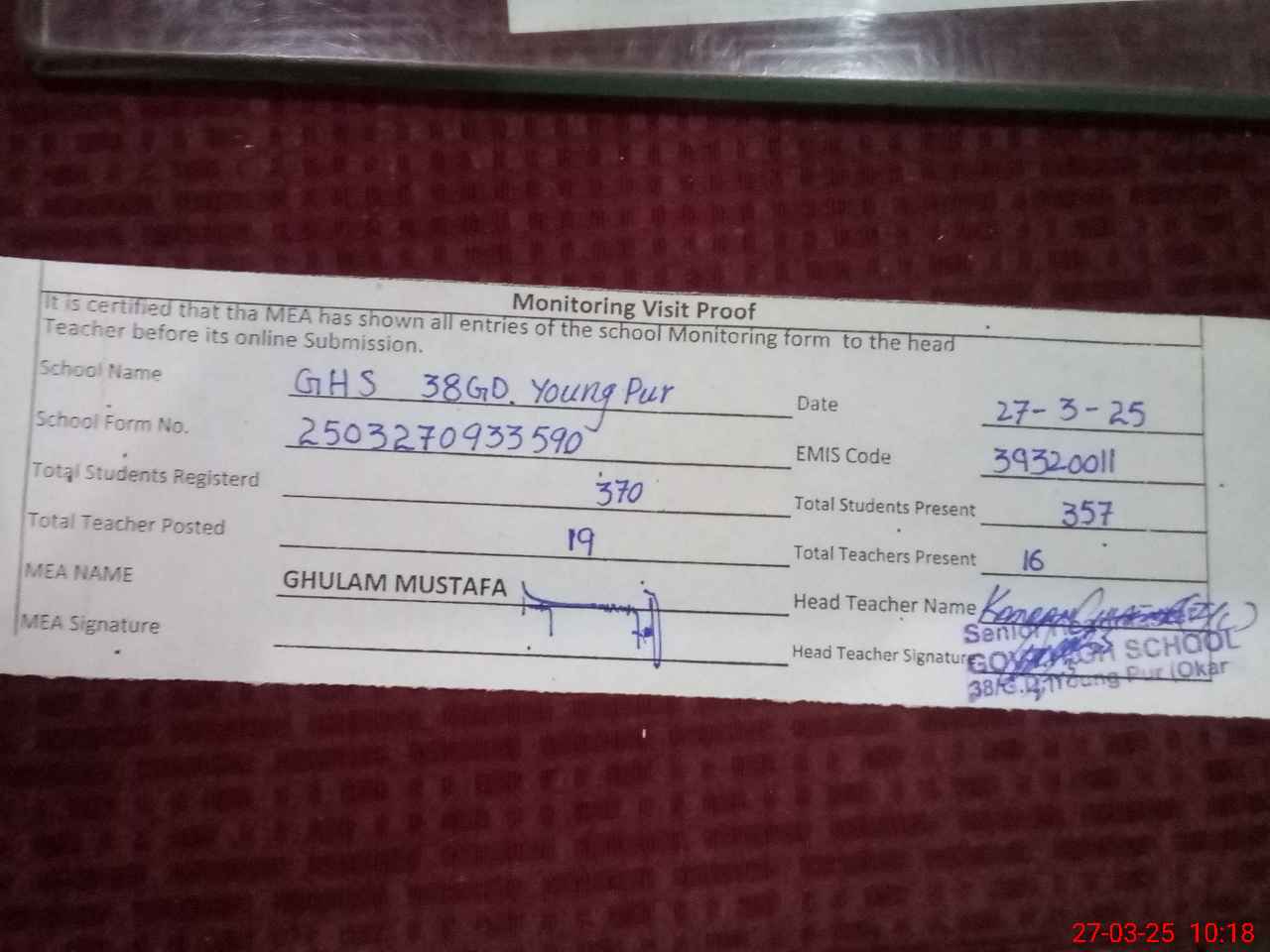 | EMIS Code: 39320011 | Name of School: GHS 38/G.D YOUNG PUR | |||