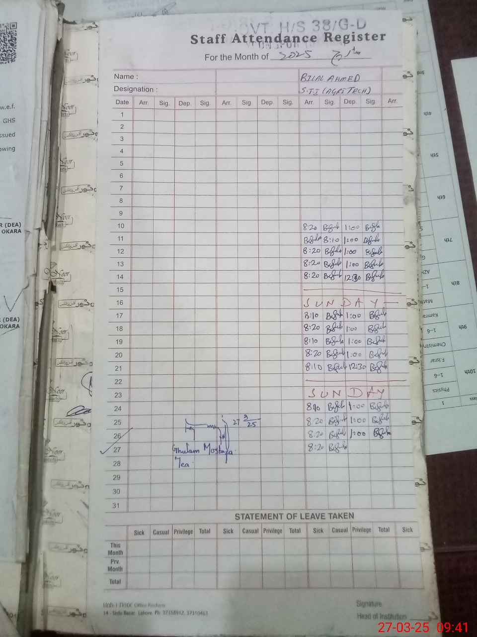 | Total no. of Classrooms: 13 No. of Classrooms Used for Teaching: 11 No. of Classrooms Storing Old Furniture, FTBs, etc: 0Comments if Any: The column of attendance gap is being filled keeping in view the students appeared in their final Examinations Howevere the attendance of the day ie 27 March 2025 is Nil |