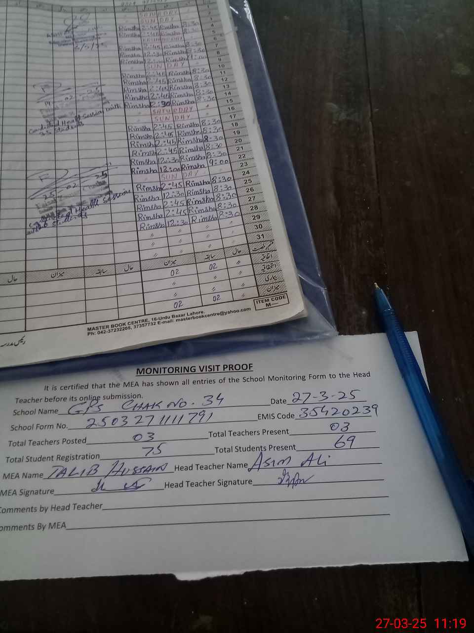 | Attendance Register | Head Teacher | MEA with School | Visit Proof |