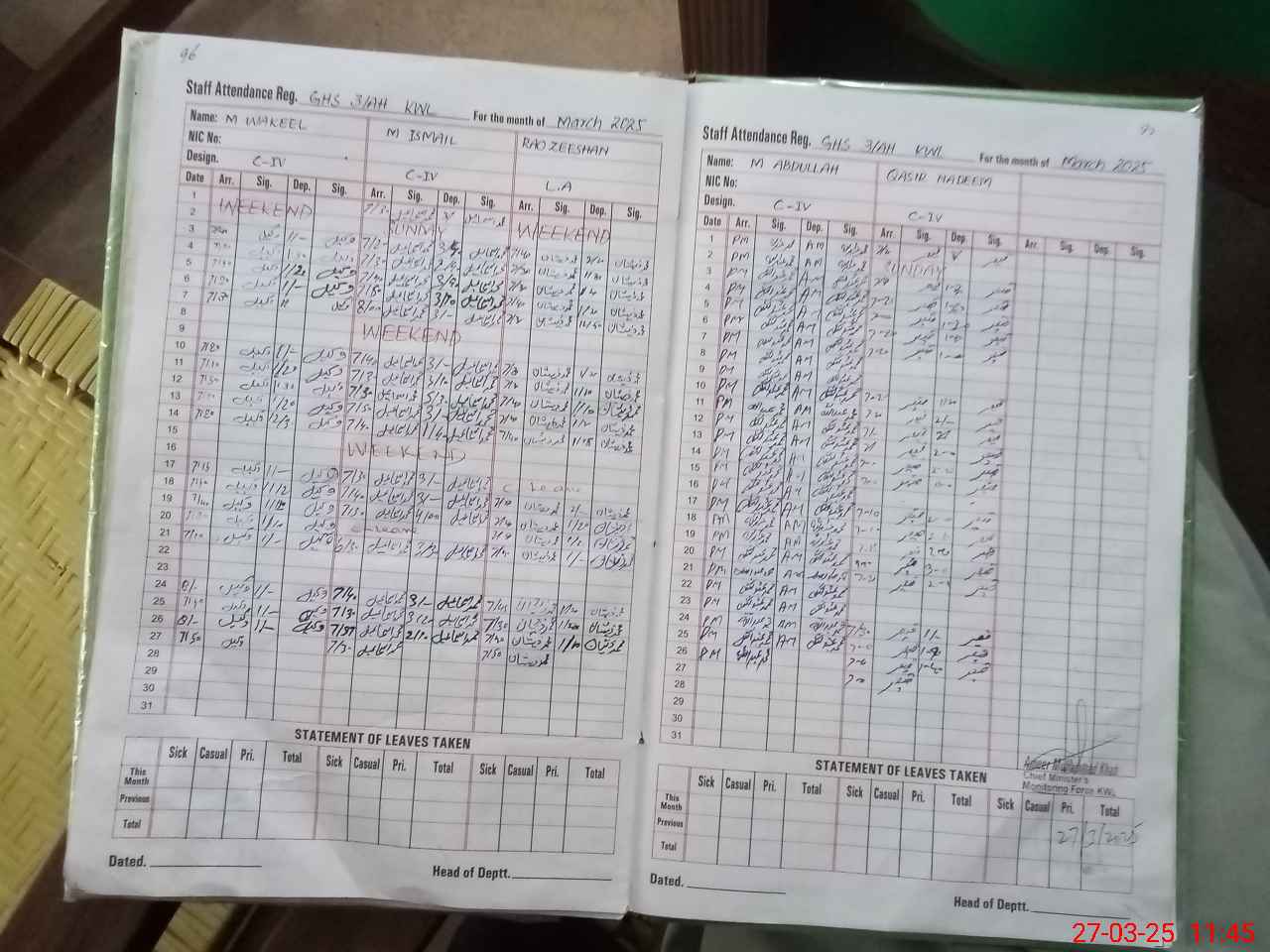 | Remarks (Use Separate Page if Required): Students attandce taken from roznamcha due to examination | |||||