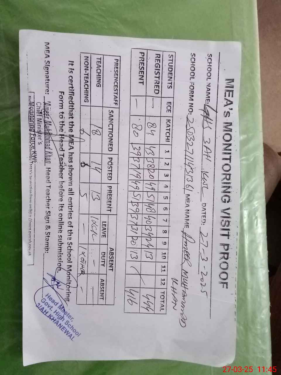 | Attendance Register | Head Teacher | MEA with School | Visit Proof |