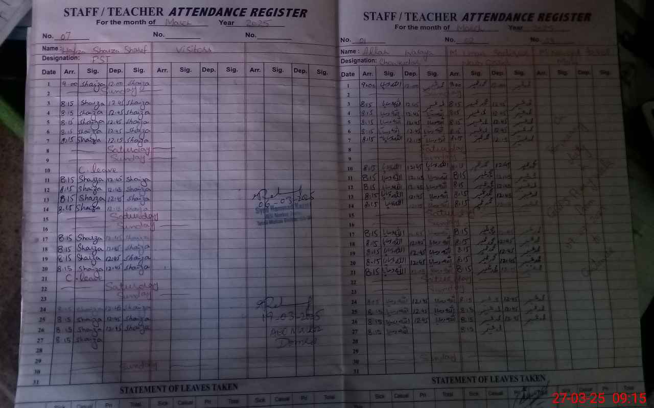 | Remarks (Use Separate Page if Required): GGES Waris Wala EMIS 36130775 Pst Dameea Batool is on temporary duty at GGES Chah vains Wala since last month but there are no fresh orders of her duty so marked her absent Mr Naveed Iqbal Designation Mali Is temp duty at GGps peery Wala since last three years But there is no fresh order of his temp duty | |||||