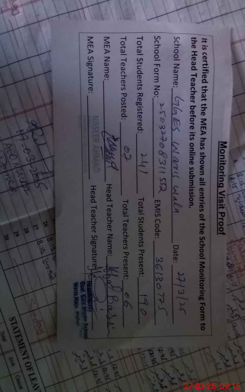 | EMIS Code: 36130775 | Name of School: GGES WARIS WALA MULTAN SADDAR | |||