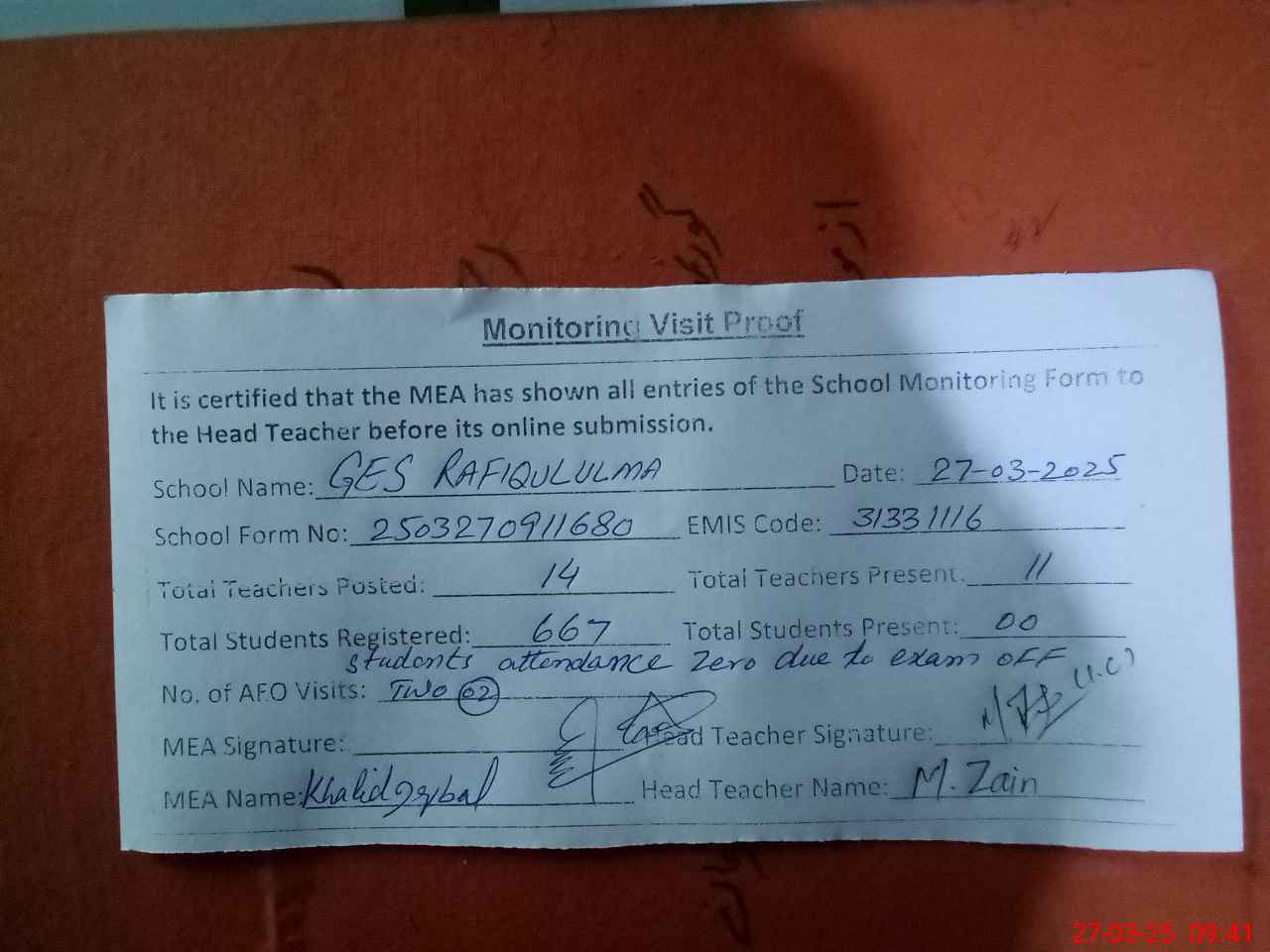 | Attendance Register | Head Teacher | MEA with School | Visit Proof |