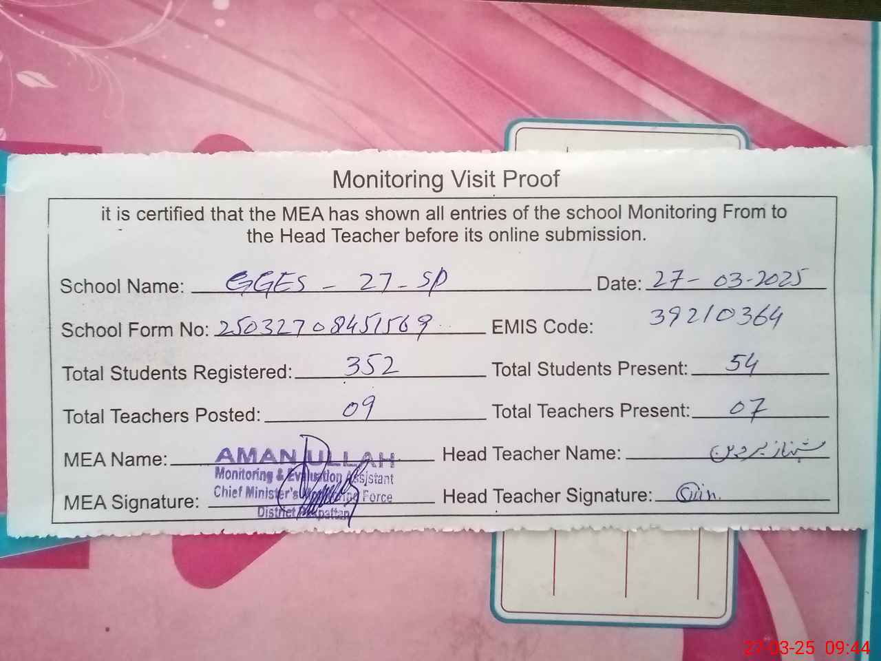 | EMIS Code: 39210364 | Name of School: GGES 27 SP | |||