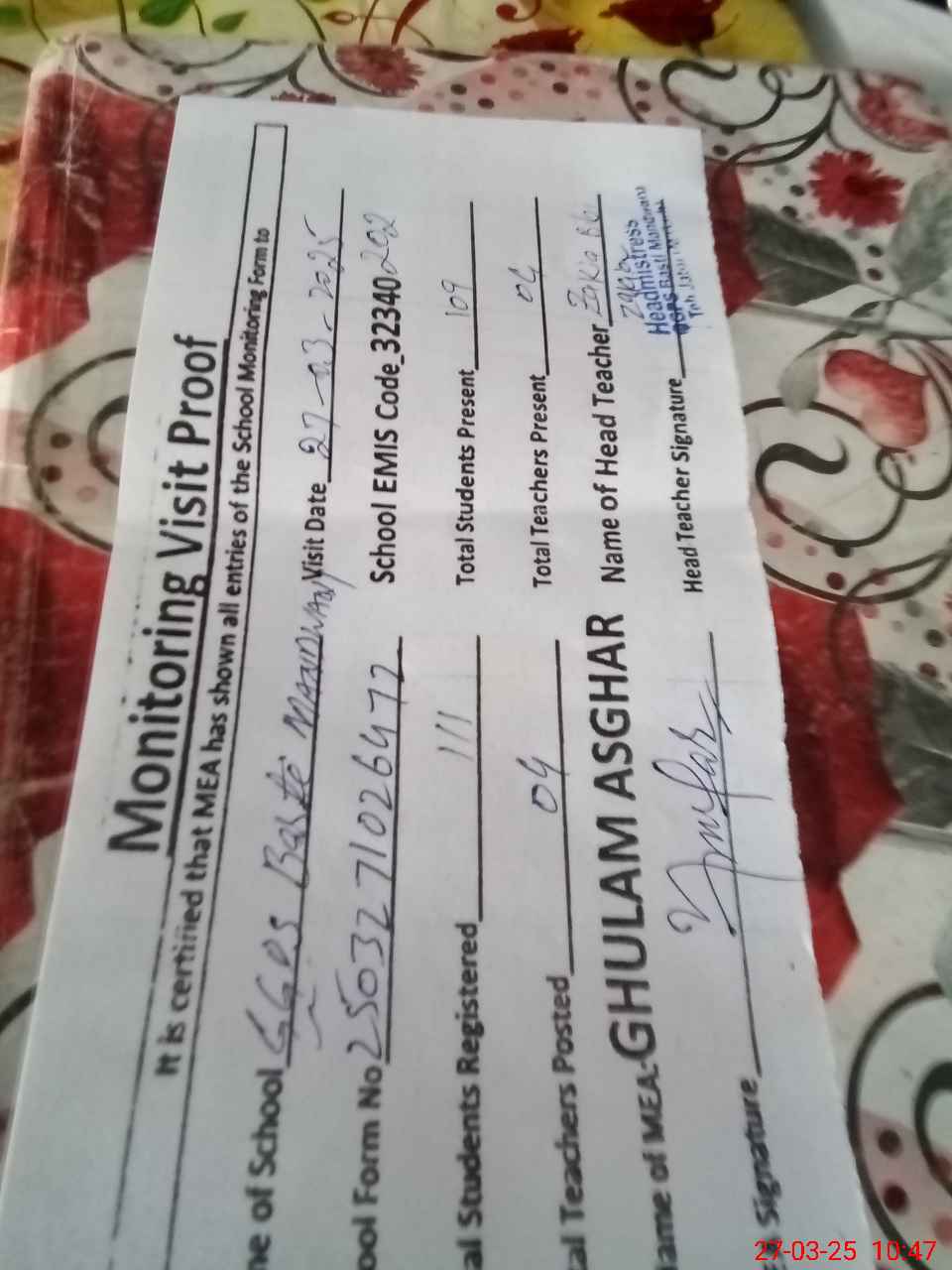 | Attendance Register | Head Teacher | MEA with School | Visit Proof |