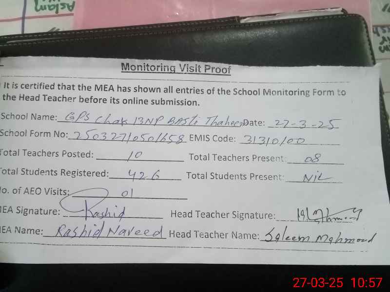 | EMIS Code: 31310100 | Name of School: GPS CHAK 13/NP BASTI THAHEEMA KHANPUR | |||