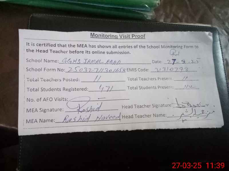 | EMIS Code: 31310793 | Name of School: GGHS JAMAL ABAD | |||