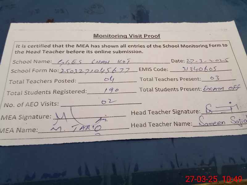 | Attendance Register | Head Teacher | MEA with School | Visit Proof |