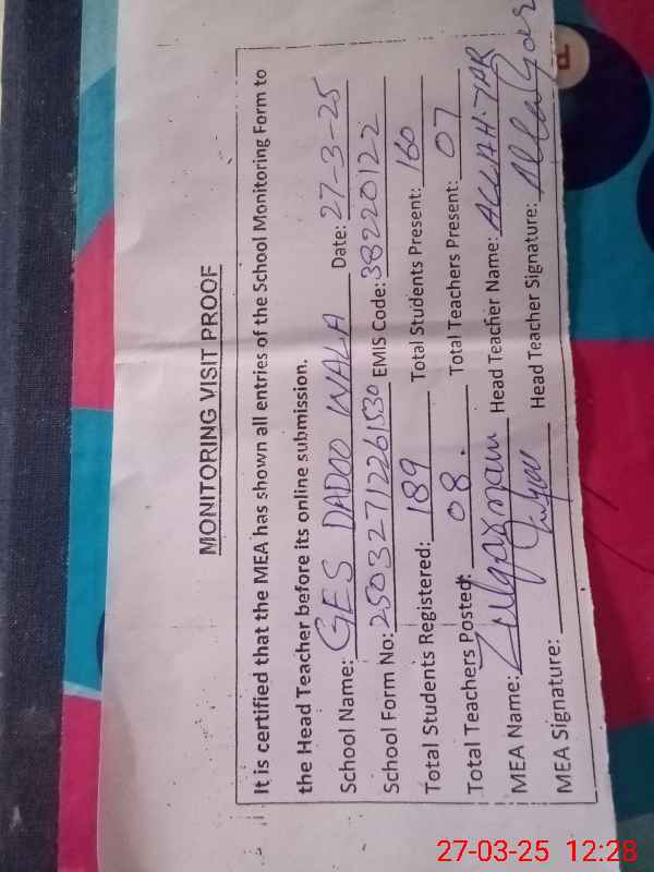 | EMIS Code: 38220122 | Name of School: GES DADOO WALA | |||