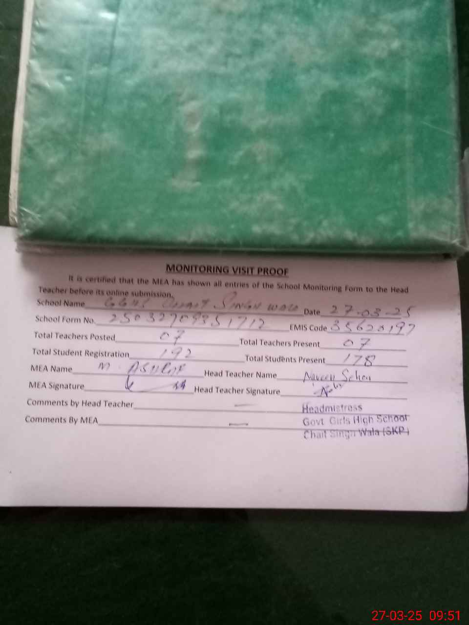 | Attendance Register | Head Teacher | MEA with School | Visit Proof |