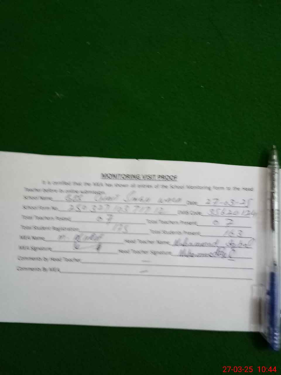 | Attendance Register | Head Teacher | MEA with School | Visit Proof |