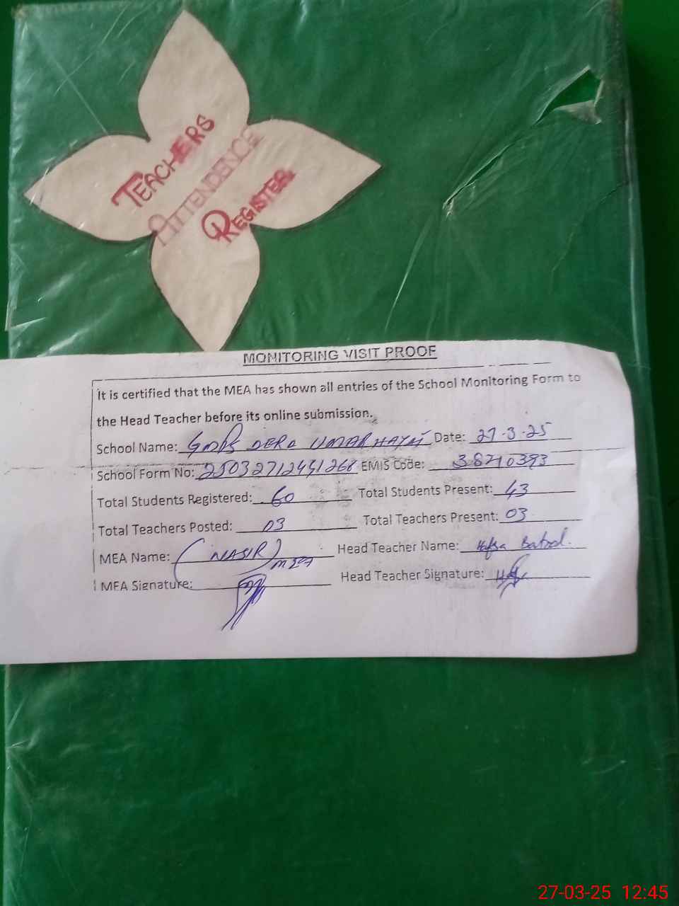 | Attendance Register | Head Teacher | MEA with School | Visit Proof |