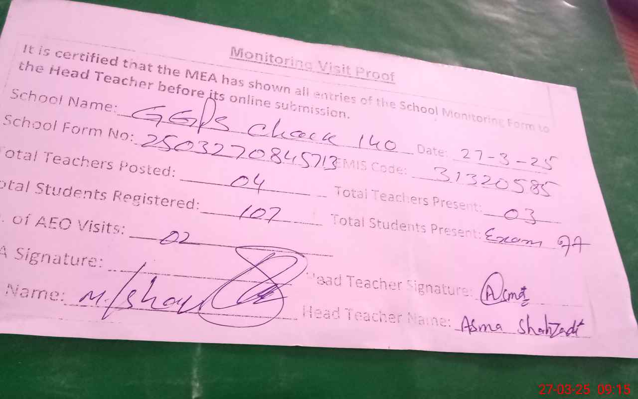 | EMIS Code: 31320585 | Name of School: GGPS CHAK NO.140/A | |||