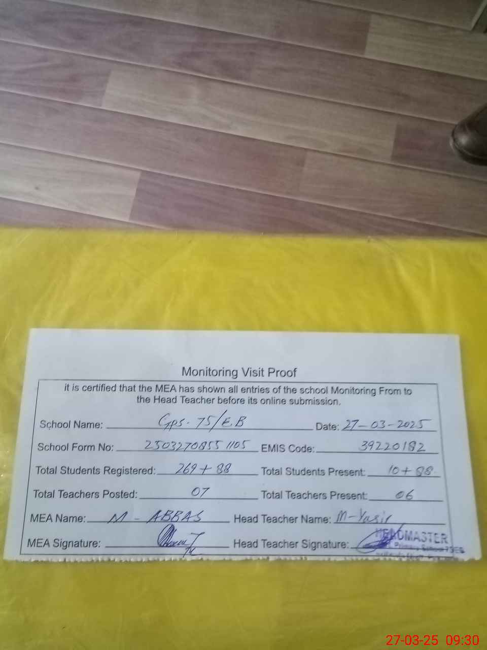 | Attendance Register | Head Teacher | MEA with School | Visit Proof |
