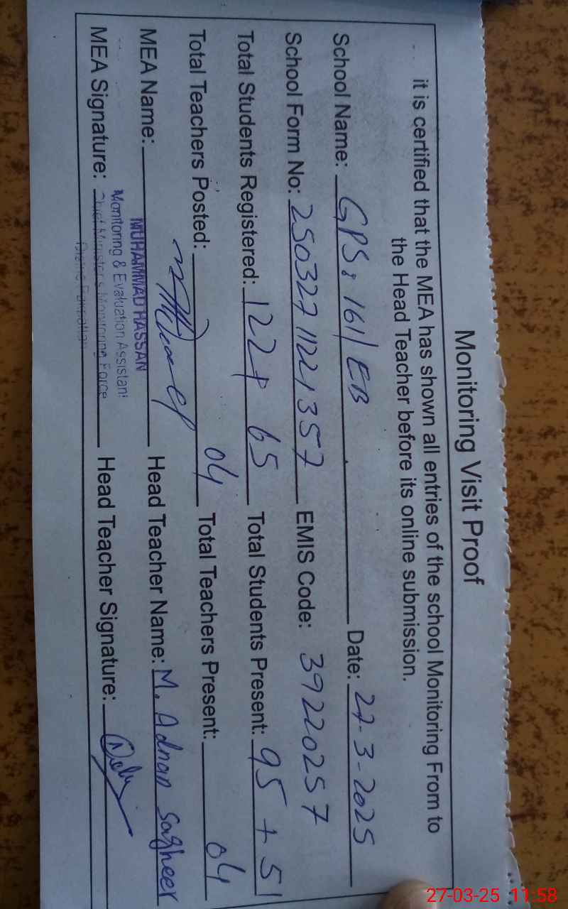 | EMIS Code: 39220257 | Name of School: GPS 161 EB | |||