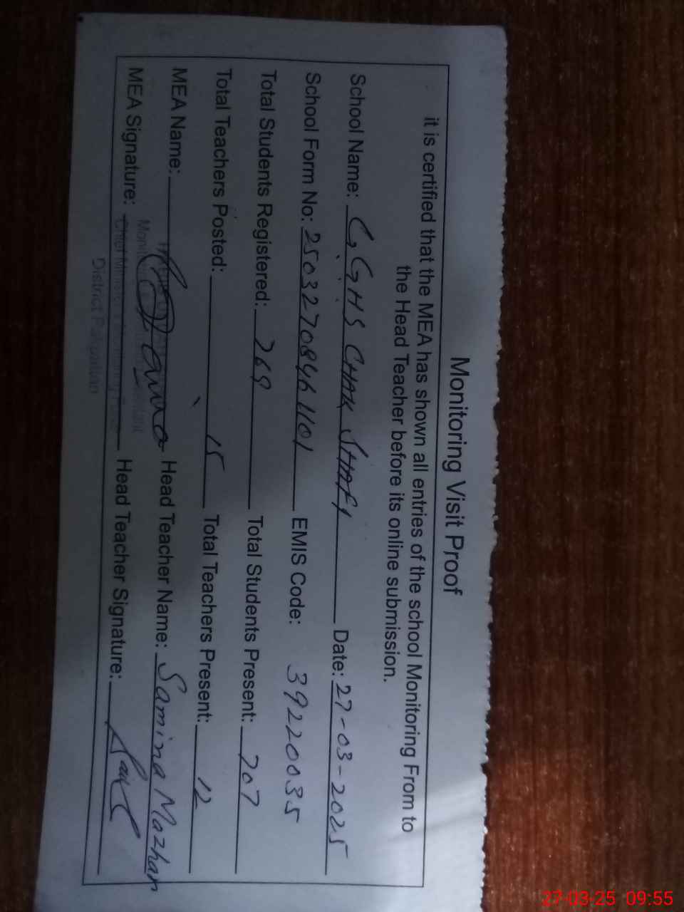 | EMIS Code: 39220035 | Name of School: GGHS CHAK SHAFI | |||