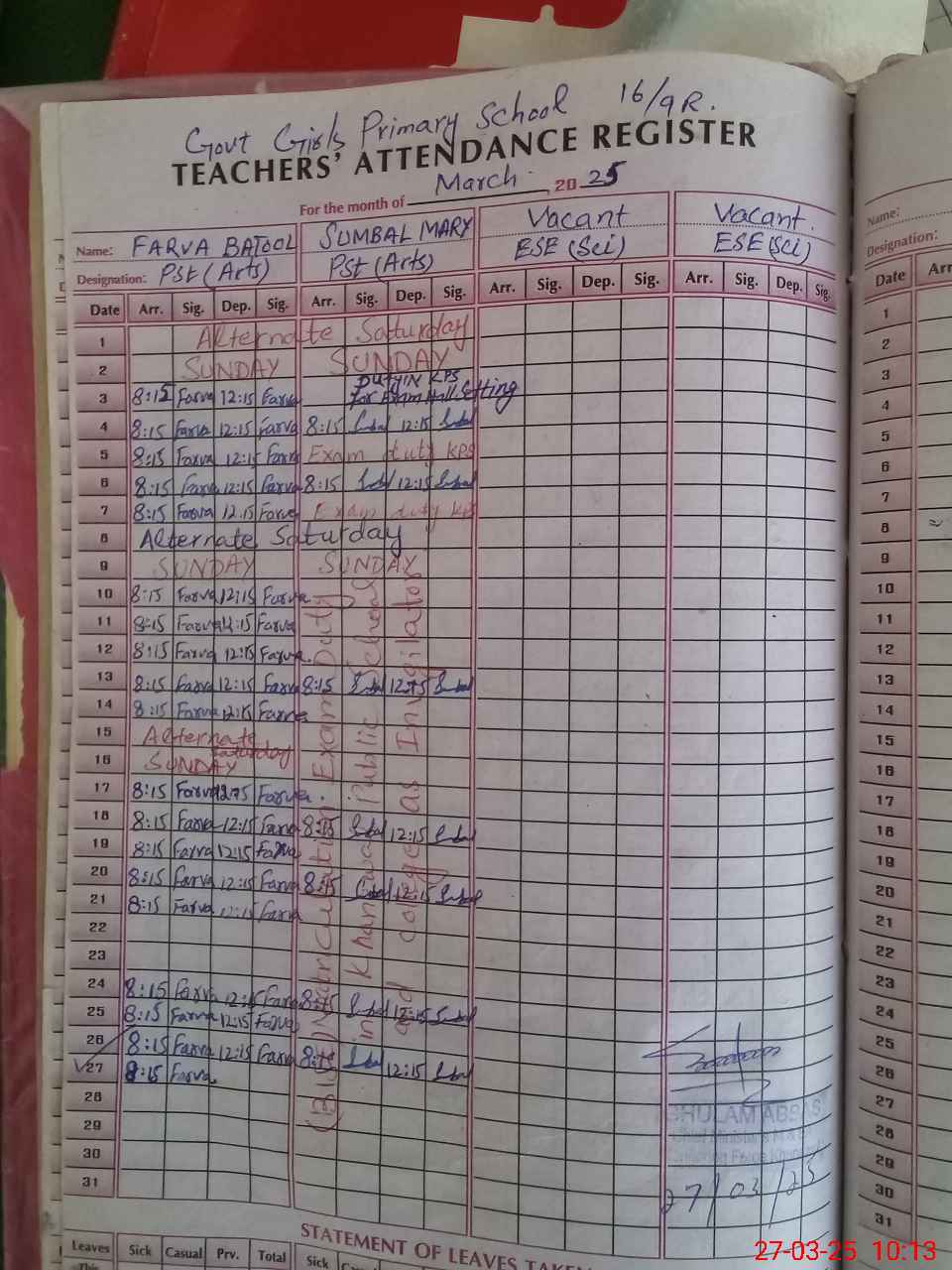 | 36**** | Su**** Ma**** | PST | Regular | 0 | 0 | 0 | 0 | 0 | 0 | 0 | 0 | 0 | Exam Duty |