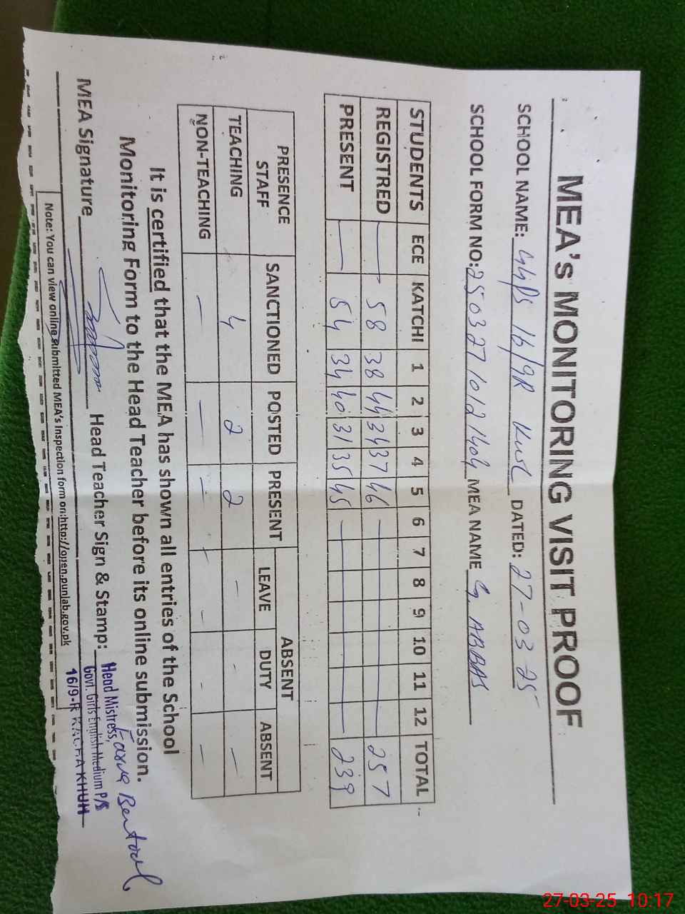 | Attendance Register | Head Teacher | MEA with School | Visit Proof |