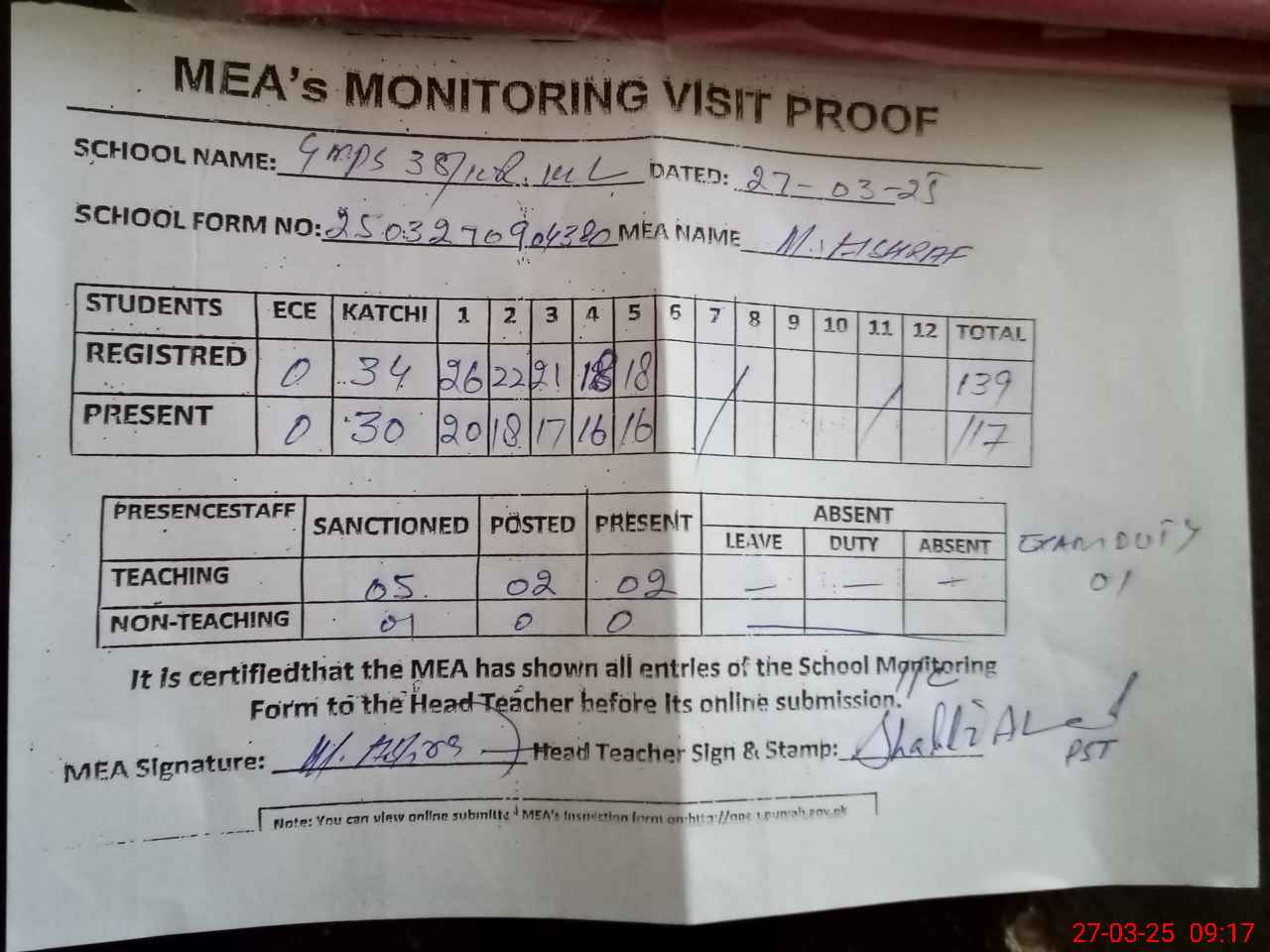 | Attendance Register | Head Teacher | MEA with School | Visit Proof |