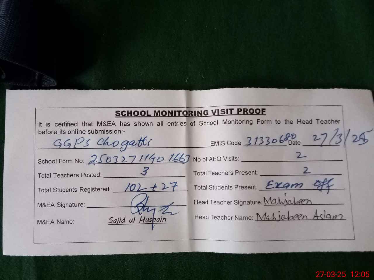 | Attendance Register | Head Teacher | MEA with School | Visit Proof |