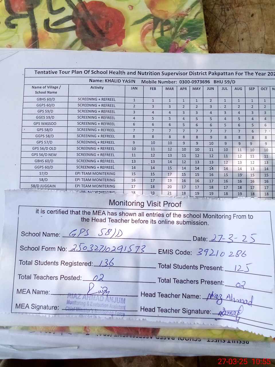 | Attendance Register | Head Teacher | MEA with School | Visit Proof |