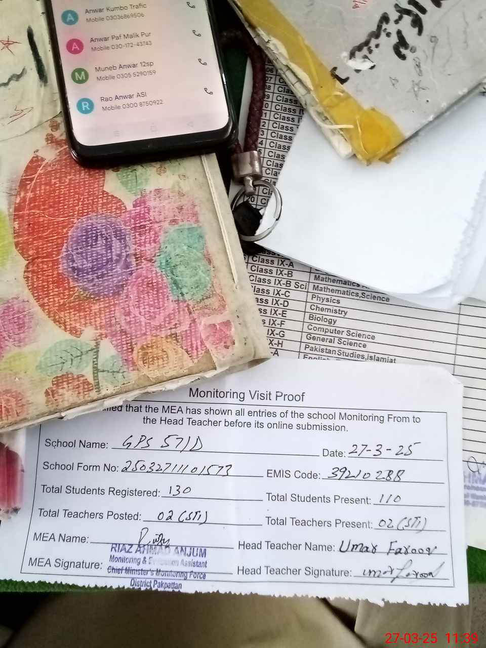 | Attendance Register | Head Teacher | MEA with School | Visit Proof |