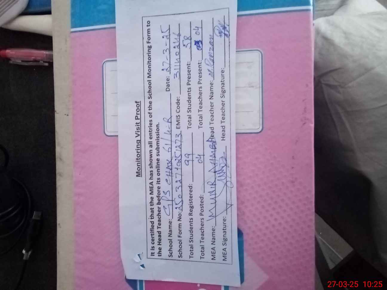 | Attendance Register | Head Teacher | MEA with School | Visit Proof |
