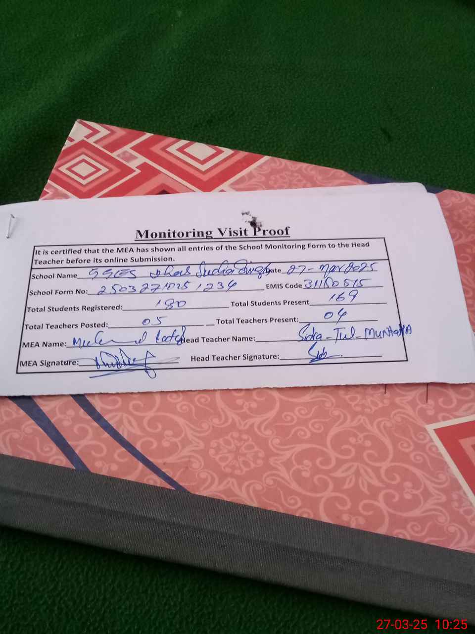 | Attendance Register | Head Teacher | MEA with School | Visit Proof |